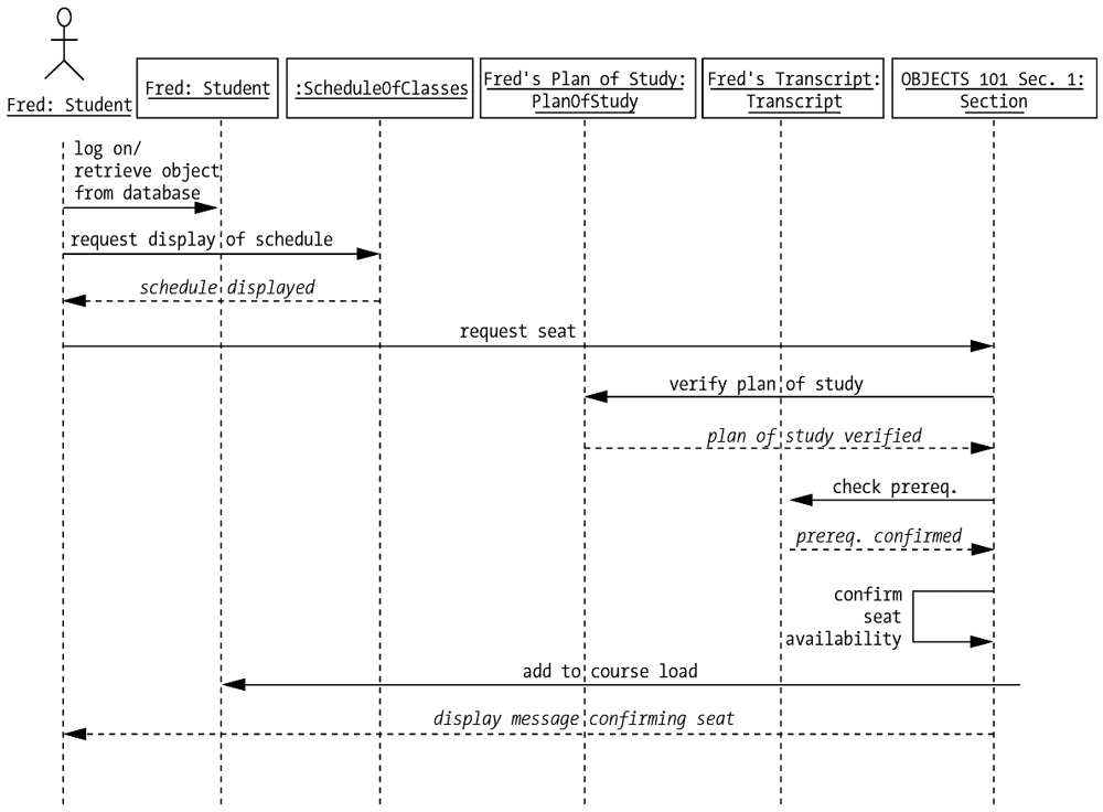 Next, the Section object sends a response back to Fred the user/actor (via the GUI) confirming his seat in the section. This is the response to the original "request seat" message that was sent by the user toward the beginning of the scenario! All of the extra "behind the scenes" processing necessary to fulfill the request—involving a Section object collaborating with a PlanOfStudy object, a Transcript object, and a Student object—is transparent to the user. As we saw earlier in the chapter, Fred merely selected a section from the schedule of classes that was displayed on the SRS GUI, clicked the Add button, and, a few moments later, saw a confirmation message appear on his screen.