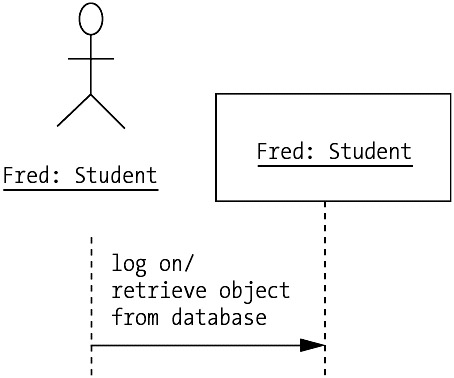 At the top of each lifeline, as appropriate, we place either an instance icon—that is, a box containing the (optional) name and class of an object participant—or a stick figure symbol to designate an actor. (For rules governing how an instance icon is to be formed, please refer back to the section on creating object diagrams in Chapter 10.)