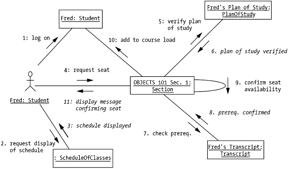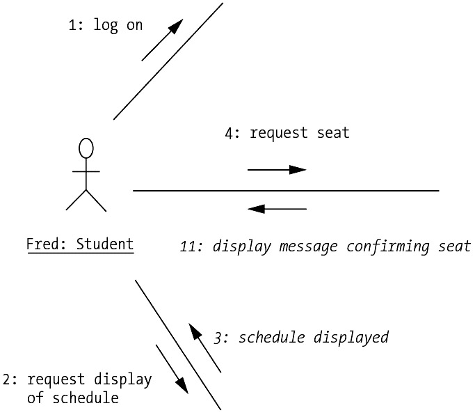 In a collaboration diagram, we eliminate the lifelines used to portray objects and actors. Rather, we lay out instance icons representing objects and stick figures representing actors in whatever configuration is most visually appealing. We then use lines and arrows to represent the flow of messages and responses back and forth between these objects/actors. Because we lose the top-to-bottom chronological sense of message flow that we had with the sequence diagrams, we compensate by numbering the arrows in the order that they would occur during execution of a particular scenario.