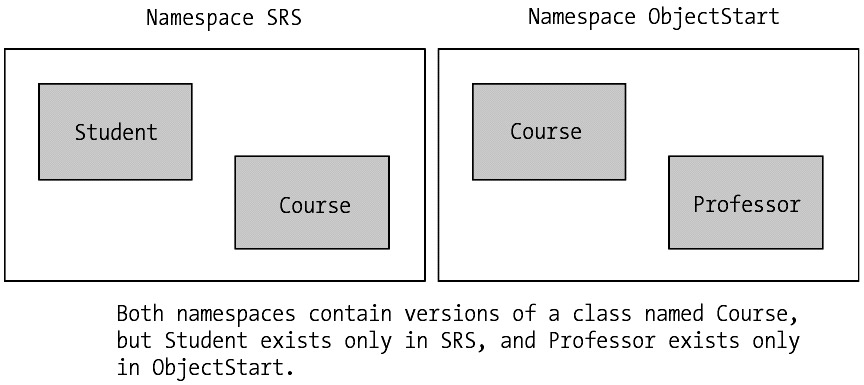 // Example.cs using ObjectStart; using SRS; public class Example { static void Main() { // Use the SRS version of Course here ... SRS.Course math = new SRS.Course(); // ... and the ObjectStart version here. ObjectStart.Course english = new ObjectStart.Course(); // etc. } }
