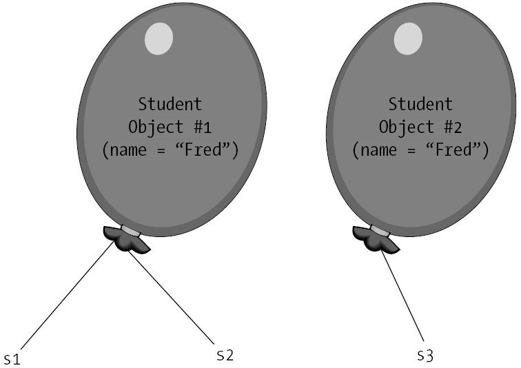 Reference variables s1 and s2 thus reference the same object in memory. Now, let's create a second Student object with the same data values as the first: