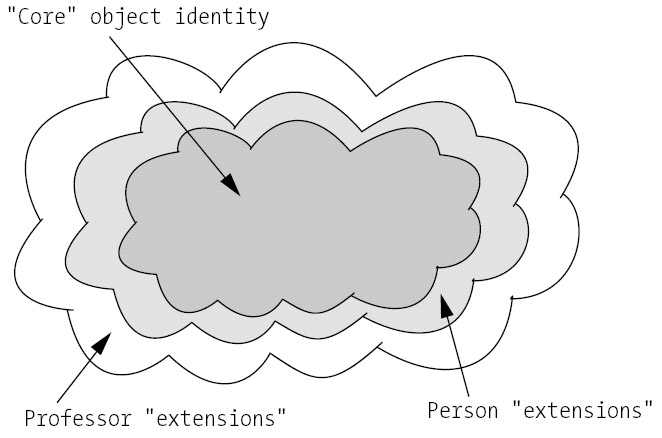 If we instead refer to the Professor object by its Person reference p, then, as far as the compiler is concerned, the only aspects of the object that exist are its Object "core" and its Person "extensions"; the "Professor-ness" of the object is in question (see Figure 13-16):
