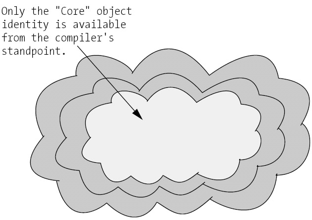 If we refer to this Professor object by its object reference o, then, as far as the compiler is concerned, the only aspects of the object that exist are its Object "core"; the "Person-ness" and "Professor-ness" of the object is in question (see Figure 13-15). So, the compiler will reject any attempts to access the Professor- or Person-defined features of o: