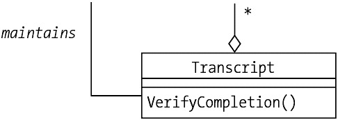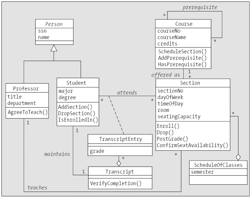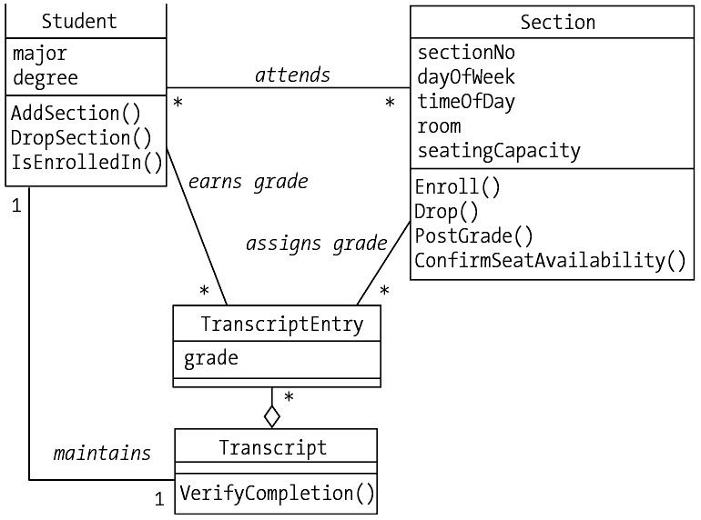 We have two examples of this: the Transcript class represents an aggregation of TranscriptEntry objects, and the ScheduleOfClasses class represents an aggregation of Section objects. |