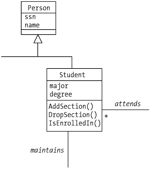 There are two fields indicated for the Student class in our class diagram—major and degree—but we learned in Chapter 10 that we must also encode associations as fields. Student participates in two associations: