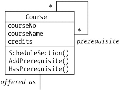 The attends association between Student and Section; the prerequisite (reflexive) association between instances of the Course class. |