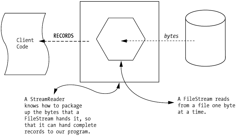 Next, we'll pass a reference to that FileStream object as an argument to the constructor for a StreamReader, a more sophisticated type of object that is effectively "wrapped around" the FileStream. The StreamReader's ReadLine method knows how to internally collect up, or buffer, individual characters as read by the FileStream until an end-of-line character is detected, at which point the StreamReader hands back a complete line/record of data to the client code.