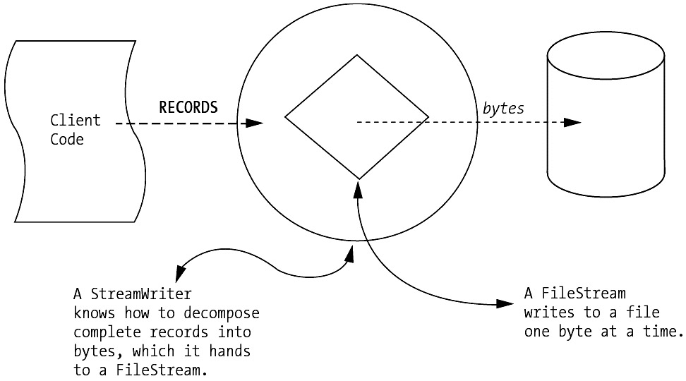 Then, we pass that FileStream object as an argument to the constructor for a StreamWriter, a more sophisticated type of object that is "wrapped around" the FileStream. The StreamWriter's WriteLine method knows how to pass an entire record/line's worth of data, one character at a time, to its encapsulated FileStream object, which then outputs the data one byte at a time to the file.