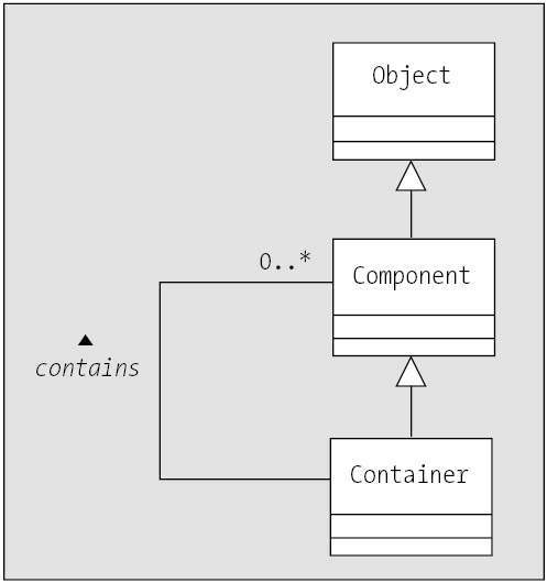 We may depict the relationship between containers, components, and objects via a UML diagram, as shown in Figure 16-1.