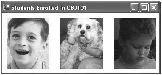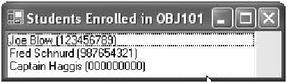 The view is the way in which we present this knowledge to the user—typically, although not exclusively, via a graphical user interface. Note that there can be many different views of the same model, in either the same or different applications. For example, with respect to the SRS GUI, we could represent the Students enrolled in a particular Section as a list of their names and student ID numbers; or as photographs; or in diagram form, as shown in Figures 16-2 through 16-4.