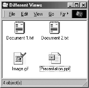 Regardless of the view chosen, however, the underlying model in our Windows example is the same: we have a directory titled "Different Views" on our file system, and it contains four files: two text documents, a GIF image, and a PowerPoint presentation, as reflected in the UML diagram in Figure 16-9.