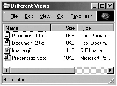 Give a single user the ability to switch among multiple views: A familiar example of this can be found within the Microsoft Windows operating system. With Windows, users are able to view the contents of a folder as icons, or as a detailed list, or as an HTML page, or even as a DOS directory listing, as shown in Figures 16-5 through 16-8.