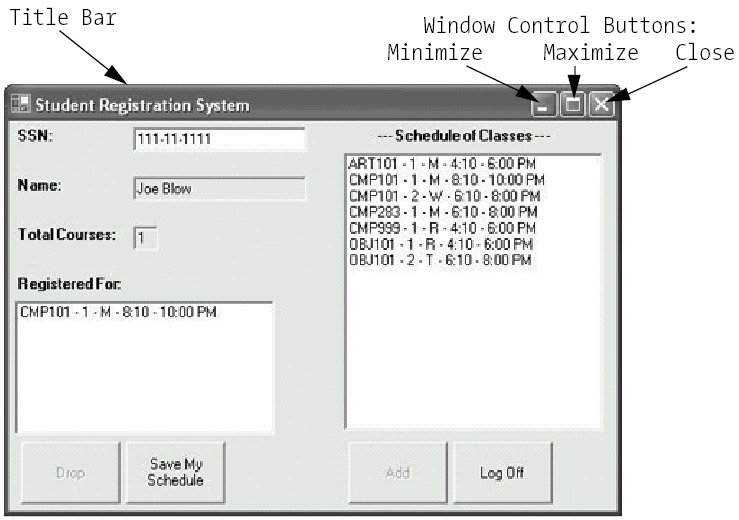 A Form has a title bar, and may optionally be equipped with a menu bar (we won't be using a menu bar for the SRS GUI as designed, however). A Form also automatically provides window control buttons in its upper right-hand corner; from left to right, the three window control buttons are used to minimize the size of, maximize the size of, or close the Form and optionally exit the application (see Figure 16-28).