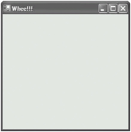 // TestForm1.cs using System; using System.Windows.Forms; public class TestForm1 { static void Main() { // Create a Form by calling the Form constructor. Form simpleForm = new Form(); // Set the size of the Form using the Height // and Width properties. simpleForm.Height = 200; simpleForm.Width = 200; // Add a title to the Form using the Text property. simpleForm.Text = "Whee!!!"; // Use the Application class Run() method to launch // the Form. Application.Run(simpleForm); } }