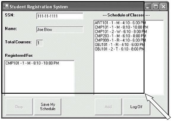 One thing to remember with GUI development is that there are multiple ways to achieve the same functional goals. That is, there is nothing "sacred" about the classes that we've chosen for the SRS GUI. We could have, for example, implemented the Add, Drop, Save, and Log Off actions using menu items rather than buttons.