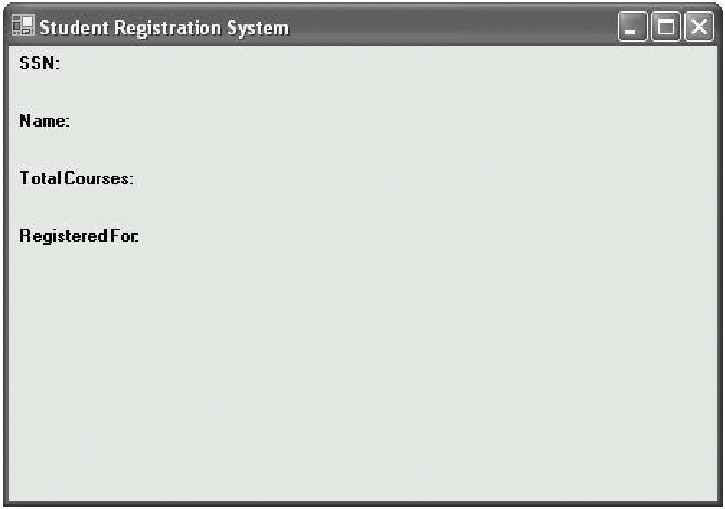 We're now finished with constructing the "view" of our SRS GUI. All of the GUI objects we'll need in order to accomplish the functionality as described in the SRS concept of operations have been created and placed onto the underlying Form. There is still some work to be done, however, because while our SRS GUI looks as it should, it doesn't actually do anything useful yet. Users can click the buttons or type something into the SSN text box, but nothing useful will happen, at least as far as student registration is concerned.
