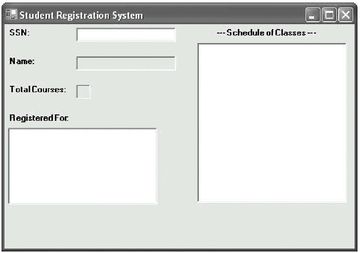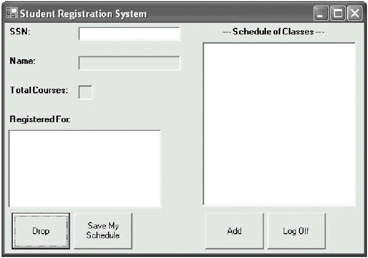 To log in to the SRS, the student will need to type his or her SSN into a field. The C# TextBox class will suit this requirement nicely. We can also use noneditable TextBox objects to display the student's name and the number of courses for which he or she is registered.