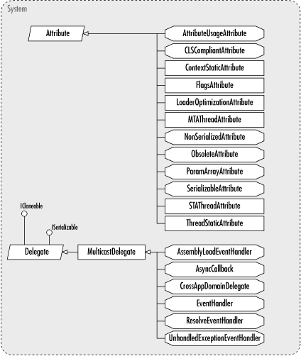 Chapter 26. SystemIn many respects, the System namespace serves as the core namespace for the .NET libraries, in much the same way java.lang does for Java programmers or stdlib.h does for C/C++ programmers. For example, the ECMA-compliant primitive-type value types are defined in the System namespace, along with complementary composite types and base types. These are used in the synthesis of type generation, which is done by the compiler on the .NET programmer's behalf (for an example of this on-the-fly type synthesis, see Array). Figure 26-1 shows many of the types in this namespace. Figure 26-1. The System namespace![]() System serves as the home for key base-type definitions, including Object, the root of every type in the .NET hierarchy. Every type in the system ultimately extends this class, making it the "root of all evil" in .NET. In addition, this namespace contains ValueType, the base type for all value types in .NET (such as the primitive types listed later in this chapter, shown in Figure 26-5), and Type, which in turn represents compile-time type information about other types defined within the .NET environment (the type metadata). More on Type can be found in Chapter 35. ECMA-compliant primitive-type value types include the fundamental types used for all .NET applications, which are basic value types such as Int32, Single, Double, Decimal, Char, Byte, and Boolean. All of the primitive types are aliased in C# with keywords such as int, double, and bool. See the description of each type for more details. See also Section 2.5. In addition to these fundamental types, there are composite types such as DateTime and TimeSpan, used to handle date- and time-based calculations without having to drop down to integer math, and Uri, used to represent references to a Universal Resource Identifier, which is the more generic form of the ubiquitous HTTP URL identifier used on the Web. In addition to these primitive and composite types, several interfaces defined here are intended as support interfaces. For example, the interfaces IConvertible, IComparable, and ICloneable let types support the same basic operations (conversion, comparison, and cloning, respectively) that the primitive types offer. Along with the base types described earlier, System contains base types that programmers do not directly reference, such as the following: