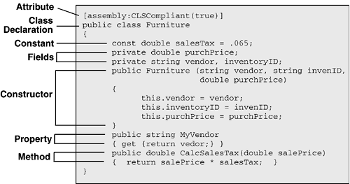 3.1. Introduction to a C# ClassFigure 3-1 displays a class declaration followed by a body containing typical class members: a constant, fields, a constructor containing initialization code, a property, and a method. Its purpose is to familiarize you with the syntax common to most C# classes and serve as a reference for later examples. Figure 3-1. Class declaration and body