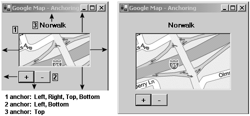The Anchor property allows a control to be placed in a fixed position relative to a combination of the top, left, right, or bottom edge of its container. Figure 6-4 illustrates the effects of anchoring. Figure 6-4. How anchoring affects the resizing and positioning of controls