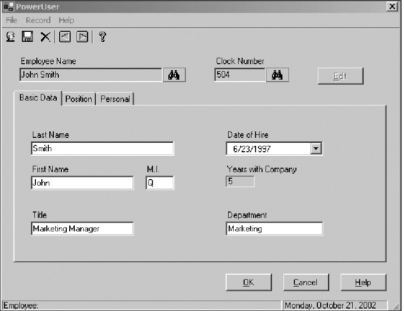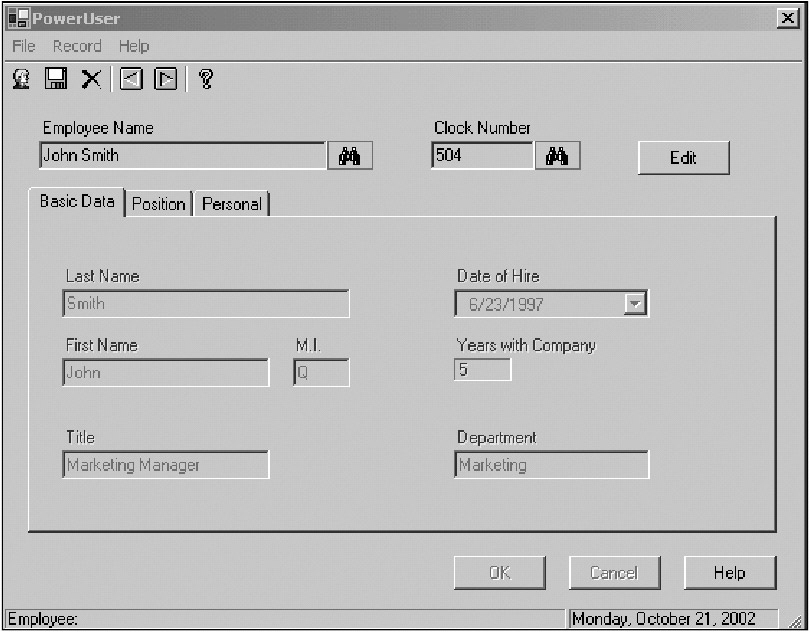 Start tabbing through the form as it is and the tab order will make sense. Even though many of the controls on the tab control have the same tab order index, only those at the top of the z-order (in this case, the first tab page) are being tabbed through. You now have a working employee record editing form. There is one last thing to add to this project, though: a shortcut to editing any record you want. You can do this via the search buttons next to the Employee Name and Clock Number fields.