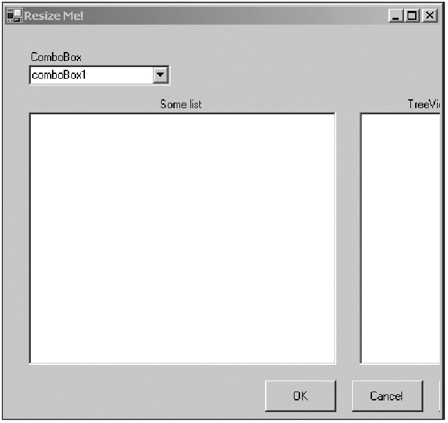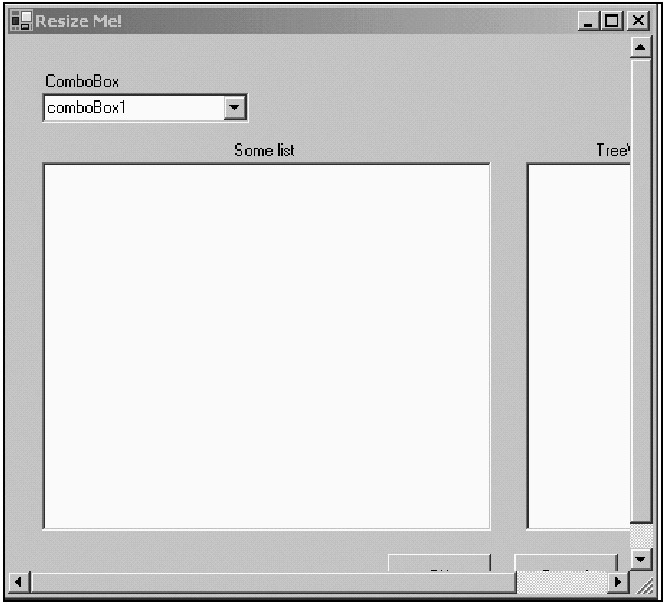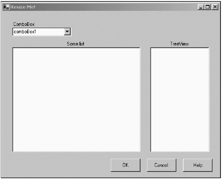 This type of form setup is very effective but also totally inelegant. It may be OK for quick-and-dirty projects and dialog box–style forms, but not for a nice program. What you need is to provide the user with the ability to size the form to any size he or she wants and still have all the controls look nice and in proportion. You will do this next.