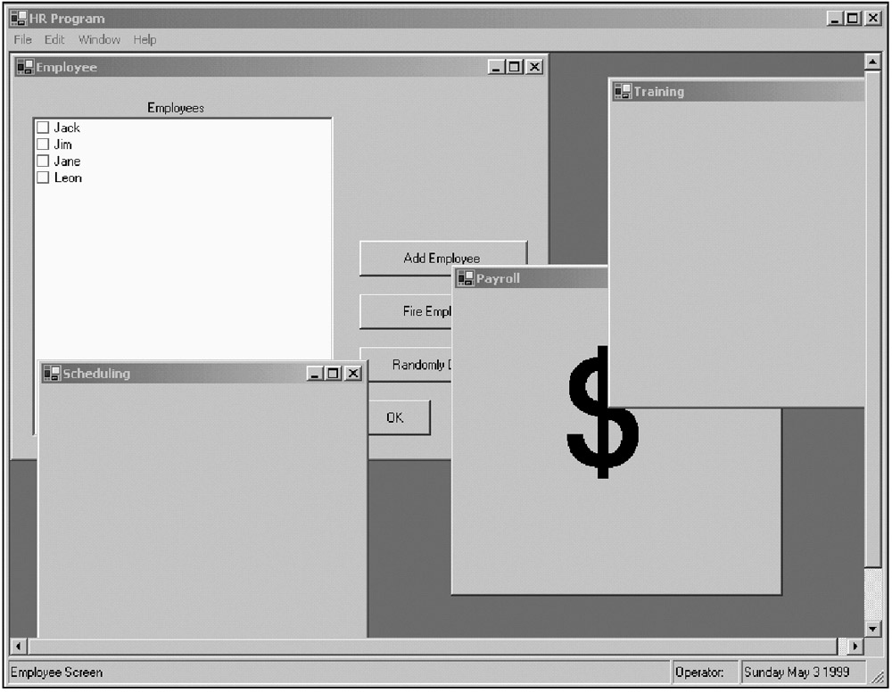Public Class UberForm Inherits System.Windows.Forms.Form #Region "Class Local Variables" Dim PayForm As Payroll Dim EmpForm As Employee Dim SkedForm As Scheduling Dim TrainForm As Training #End Region #Region " Windows Form Designer generated code " Public Sub New() MyBase.New() 'This call is required by the Windows Form Designer. InitializeComponent() Me.Menu = mainMenu1 AddHandler mnuClose.Click, New EventHandler(AddressOf Me.CloseMe) AddHandler mnuEmp.Click, New EventHandler(AddressOf Me.OpenWindow) AddHandler mnuSked.Click, New EventHandler(AddressOf Me.OpenWindow) AddHandler mnuPayroll.Click, New EventHandler(AddressOf Me.OpenWindow) AddHandler mnuTrain.Click, New EventHandler(AddressOf Me.OpenWindow) AddHandler mnuCloseAll.Click, New EventHandler(AddressOf Me.CloseAllWindows) AddHandler mnuHoriz.Click, New EventHandler(AddressOf Me.ArrangeWindow) AddHandler mnuVert.Click, New EventHandler(AddressOf Me.ArrangeWindow) AddHandler mnuCascade.Click, New EventHandler(AddressOf Me.ArrangeWindow) End Sub ... ... ... #End Region Private Sub UberForm_Load(ByVal sender As System.Object, _ ByVal e As System.EventArgs) Handles MyBase.Load End Sub #Region "Events" Private Sub CloseMe(ByVal sender As Object, ByVal e As EventArgs) Me.Close() End Sub Private Sub OpenWindow(ByVal sender As Object, ByVal e As EventArgs) Dim m As MenuItem If sender.GetType() Is GetType(MenuItem) Then m = CType(sender, MenuItem) Else Return End If If m Is mnuEmp Then If EmpForm Is Nothing Then EmpForm = New Employee() AddHandler EmpForm.Disposed, AddressOf Me.ByByWindow EmpForm.MdiParent = Me EmpForm.Show() Else EmpForm.Focus() End If End If If m Is mnuTrain Then If TrainForm Is Nothing Then TrainForm = New Training() AddHandler TrainForm.Disposed, AddressOf Me.ByByWindow TrainForm.MdiParent = Me TrainForm.Show() Else TrainForm.Focus() End If End If If m Is mnuPayroll Then If PayForm Is Nothing Then PayForm = New Payroll() AddHandler PayForm.Disposed, AddressOf Me.ByByWindow PayForm.MdiParent = Me PayForm.Show() Else PayForm.Focus() End If End If If m Is mnuSked Then If SkedForm Is Nothing Then SkedForm = New Scheduling() AddHandler SkedForm.Disposed, AddressOf Me.ByByWindow SkedForm.MdiParent = Me SkedForm.Show() Else SkedForm.Focus() End If End If End Sub Private Sub ArrangeWindow(ByVal sender As Object, ByVal e As EventArgs) Dim m As MenuItem If sender.GetType() Is GetType(MenuItem) Then m = CType(sender, MenuItem) Else Return End If If m Is mnuHoriz Then Me.LayoutMdi(MdiLayout.TileHorizontal) End If If m Is mnuVert Then Me.LayoutMdi(MdiLayout.TileVertical) End If If m Is mnuCascade Then Me.LayoutMdi(MdiLayout.Cascade) End If End Sub Private Sub CloseAllWindows(ByVal sender As Object, ByVal e As EventArgs) If Not EmpForm Is Nothing Then EmpForm.Dispose() End If If Not PayForm Is Nothing Then PayForm.Dispose() End If If Not TrainForm Is Nothing Then TrainForm.Dispose() End If If Not SkedForm Is Nothing Then SkedForm.Dispose() End If End Sub Private Sub ByByWindow(ByVal sender As Object, ByVal e As EventArgs) If sender Is EmpForm Then EmpForm = Nothing End If If sender Is PayForm Then PayForm = Nothing End If If sender Is TrainForm Then TrainForm = Nothing End If If sender Is SkedForm Then SkedForm = Nothing End If End Sub #End Region End Class