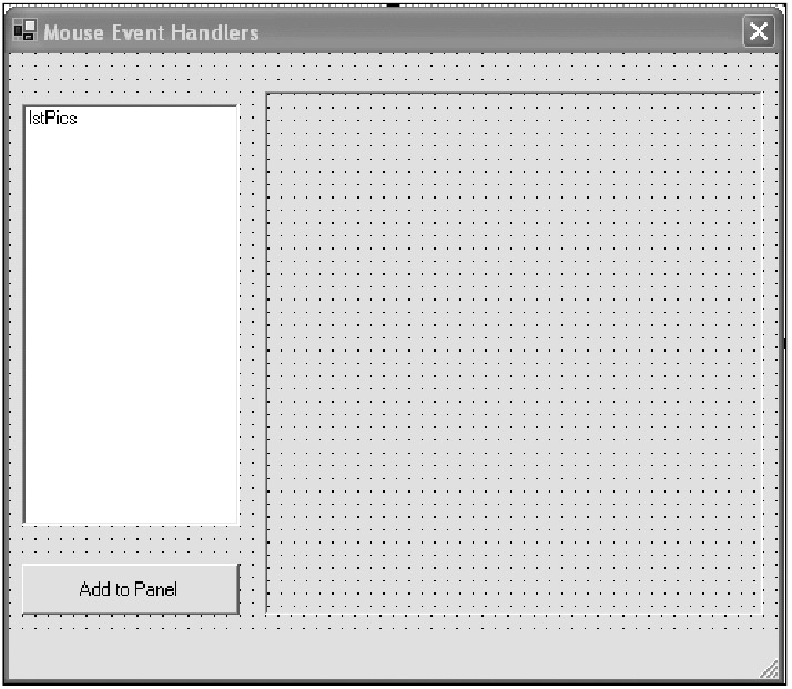 The first part of this example includes everything you have learned so far about basic controls, keyboard event handling, and mouse event handling. The second part of this example, however, extends the mouse-handling capability by adding some GDI+ capability. As an end result, you will see a familiar interface (these days) and you will also know how to program this type of interface.