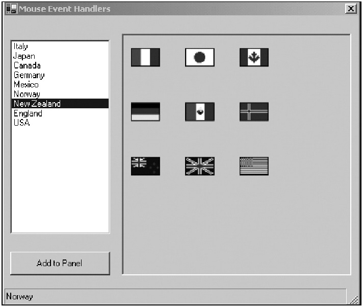 I also assign some standard delegates to each PictureBox I make. When I have done all this, I call the ArrangeImages method, and violá—instant flags! Figure 4-7 shows this example with all the flags in the Panel.