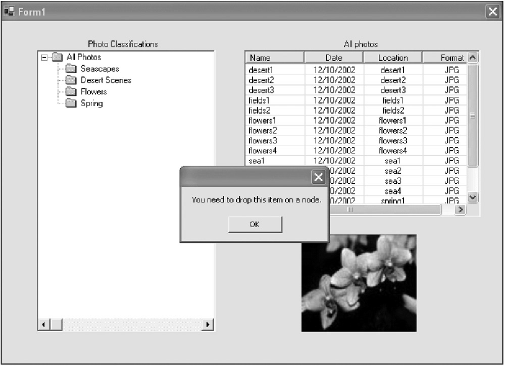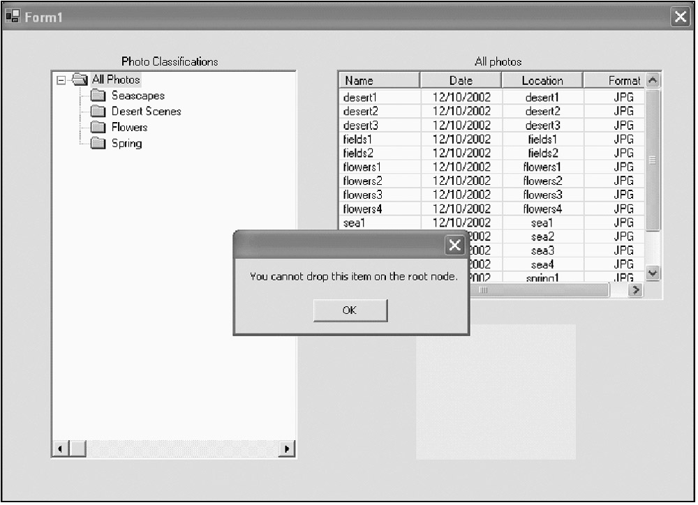There's actually no need at all for these two error messages. Wouldn't it be nice if while you were dragging the photograph over the tree, the node under the mouse would highlight? Wouldn't it also be nice to highlight only the nodes that can accept the photographs? If you were able to do these two things, you could get rid of some postdrop validation code and an annoying error message for the user. Try adding the following delegate to the TreeView delegate region.