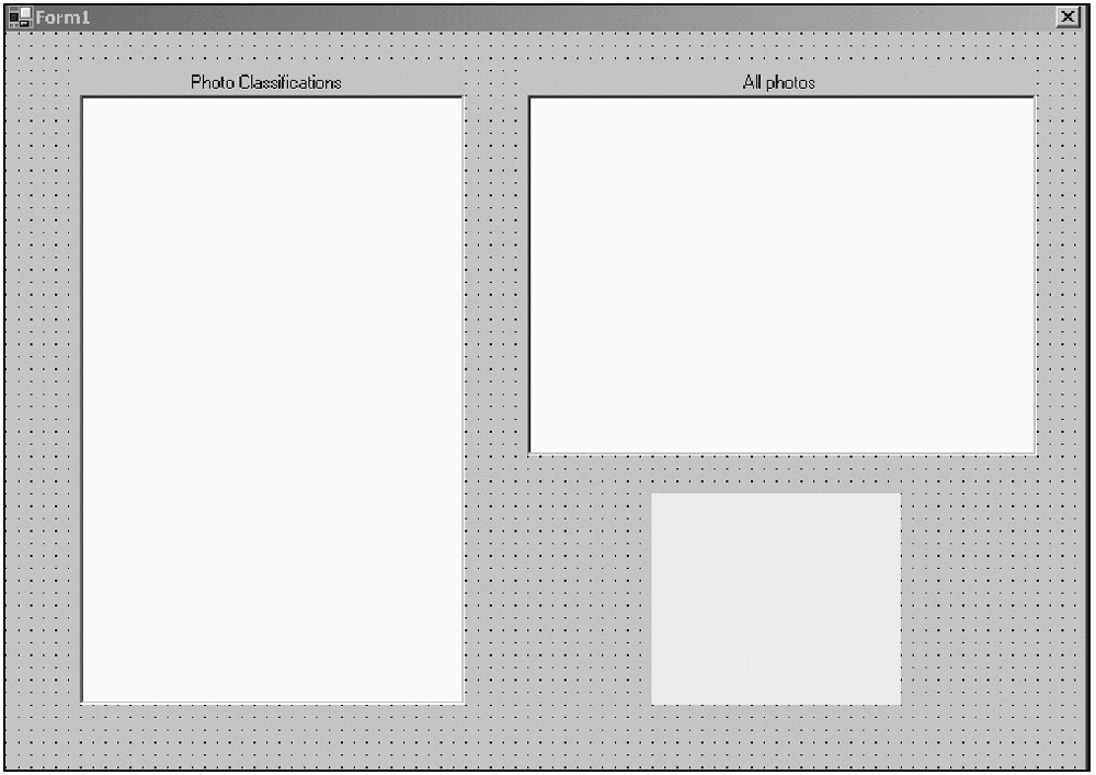 This next example uses a TreeView, a PictureBox, and a ListView control to present a mock photo album screen. It allows transfer of data from the ListView control to the TreeView control while the PictureBox is used to view the actual photo.