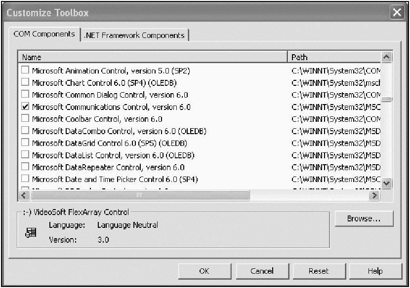Choose the COM Components tab in the Customize Toolbox window and check the Microsoft Communications Control option, as shown in Figure 6-9.