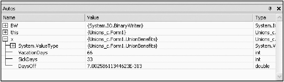 Interesting, eh? The Interop services namespace defines the StructLayout attributes. As you can see here, I lay out the VacationDays variable at offset 0. Because this is an integer, I lay out the next variable, SickDays, at offset 4. An integer takes 4 bytes. This makes them sequential. The next variable is a double, which is 8 bytes. I lay this out at offset 0. This variable overlays the two integers exactly, just like what is shown in Figure 6-12.