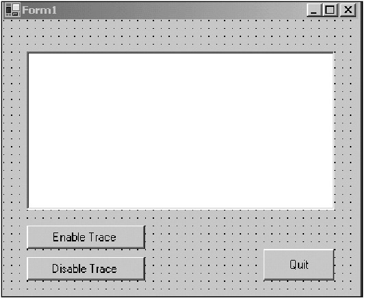 When you create a program, you do not want any special buttons on the form to turn tracing on and off. The better way is to have your program read a configuration file and determine the state of the trace switch at runtime. This way, you shut down the program, edit the configuration file switch, and turn on the program, and you have instant tracing.