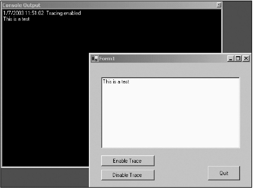 Now run your program and the trace message in the Form_Load delegate gets written to the console screen. In fact, the console screen appears at start-up.