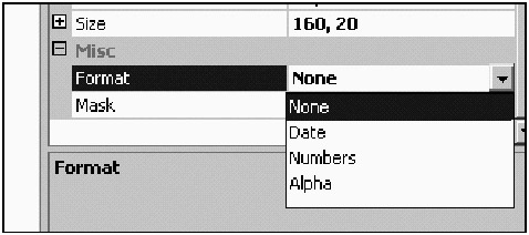 You can see that this new control looks the same as the TextBox. Click the Masked Edit control and look at the properties. You should see the two new properties at the bottom of the list. Click the Format property and the enumeration will appear (see Figure 8-10).