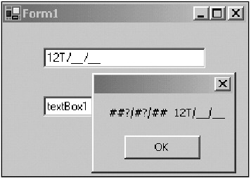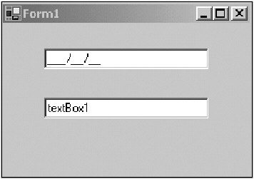 Choose None for a format and enter the following mask property: ##?/#?/##. This means allow two numbers, one alpha, a literal, a number, an alpha, a literal, and two numbers. Run the program and your form should look like Figure 8-11.