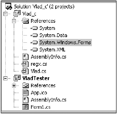 This class has no user interface (obviously), so I will get right down to the code. The first thing to do is add a reference to the System.Windows.Forms DLL. You do this in the project window. Figure 8-13 shows the project after the reference has been added.