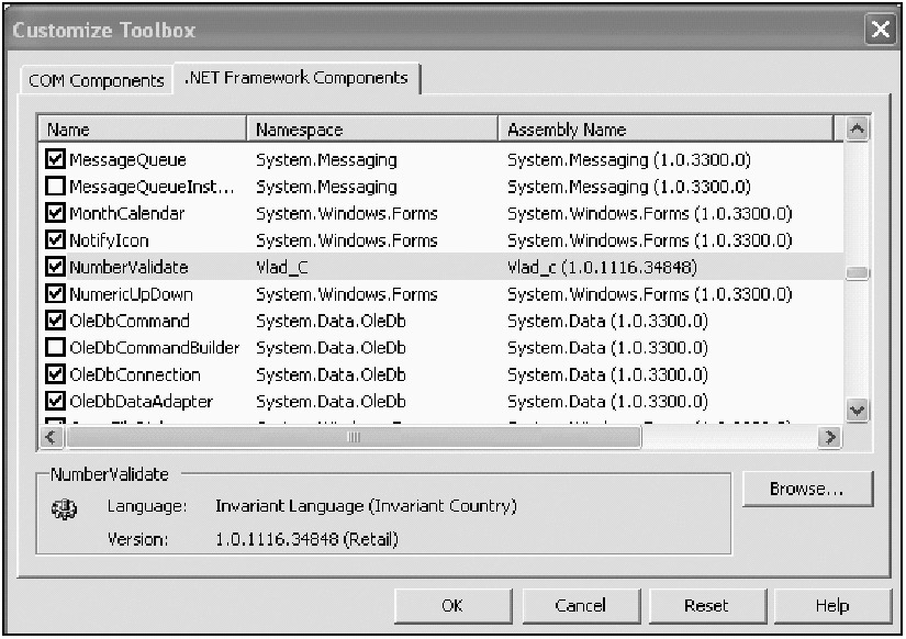 Now for the magic. While you are in the form, open up the Toolbox. Right-click the Toolbox and choose the .NET Framework Components tab, as shown in Figure 8-14. This is just like choosing the custom TextBox you made in the last example.