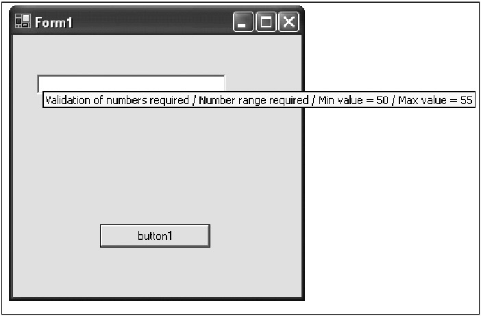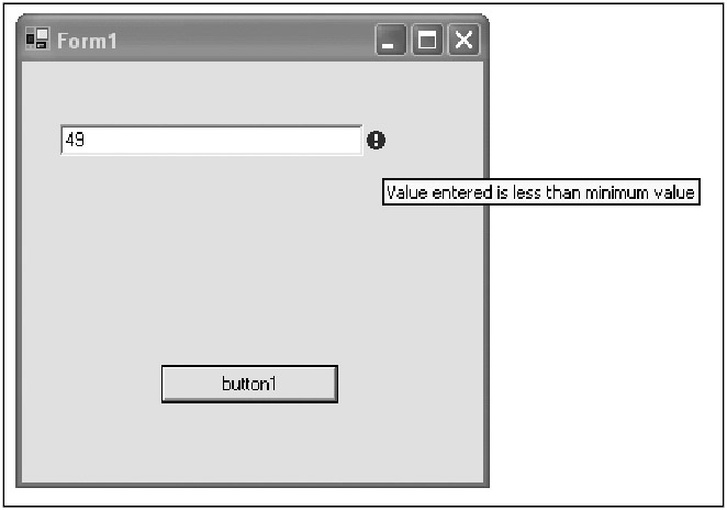 Enable the two required properties and change the MinValue to 50 and the MaxValue to 55. Now run the program. Figure 8-16 shows my form after I exited the TextBox with an invalid entry.
