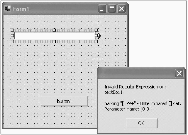 The neat thing about all this new error code is that it happens at design time. Figure 8-19 shows my form at design time when I enter in the following regular expression: [0-9+. Enter this in and click another property or on the form itself.