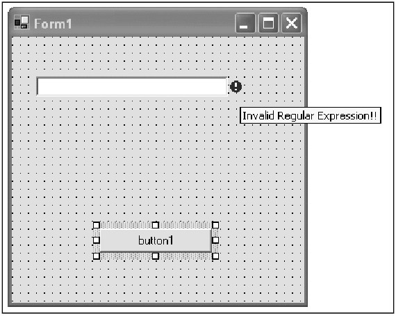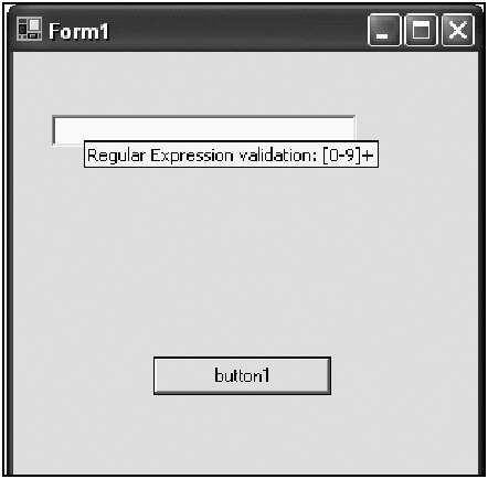 Before you leave this section, you will need to test the functionality of this control. I leave it up to you to enter in any regular expression you like and prove to yourself that it works. Try the regular expression shown in Figure 8-21. Remember that this control does not do on-the-fly validation. It validates only when you leave the control.