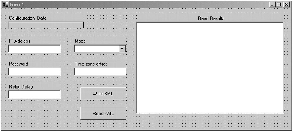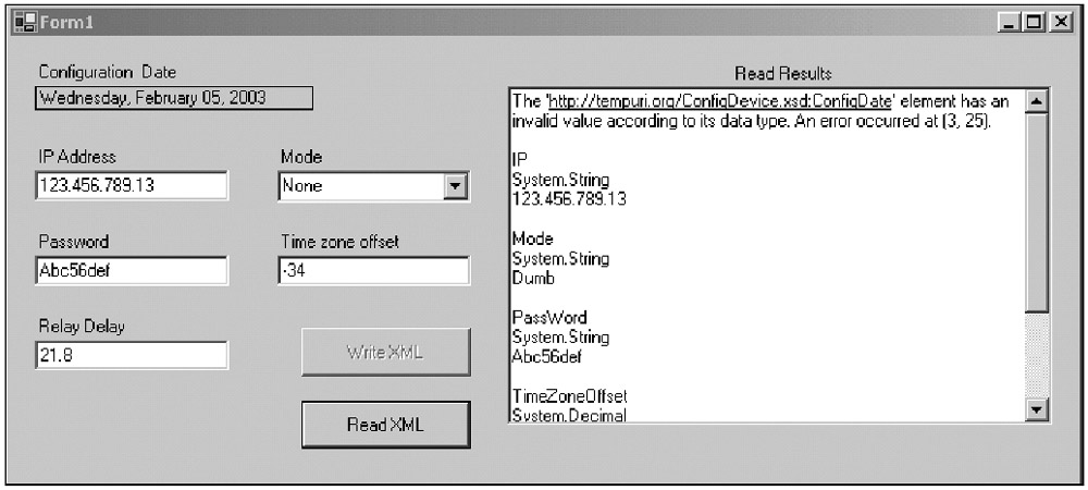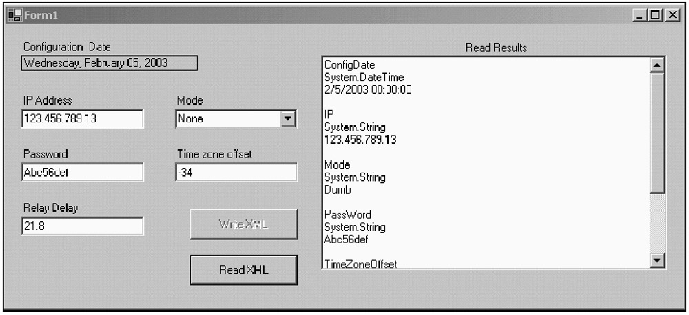Compile and run the program. Click the Write XML button then the Read XML button. Figure 9-8 shows the form after reading the XML file.