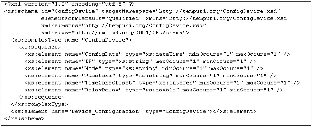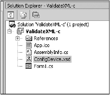 Go to the Solution Explorer window and add a new XML Schema to your project. You will see a blank page with two tabs at the bottom left of the page. One tab is for viewing the controls for the page and the other is for viewing the actual XML code generated by said controls. Name this new XML Schema ConfigDevice.xsd. Figure 9-5 shows my Solution Explorer window after I added the new item.