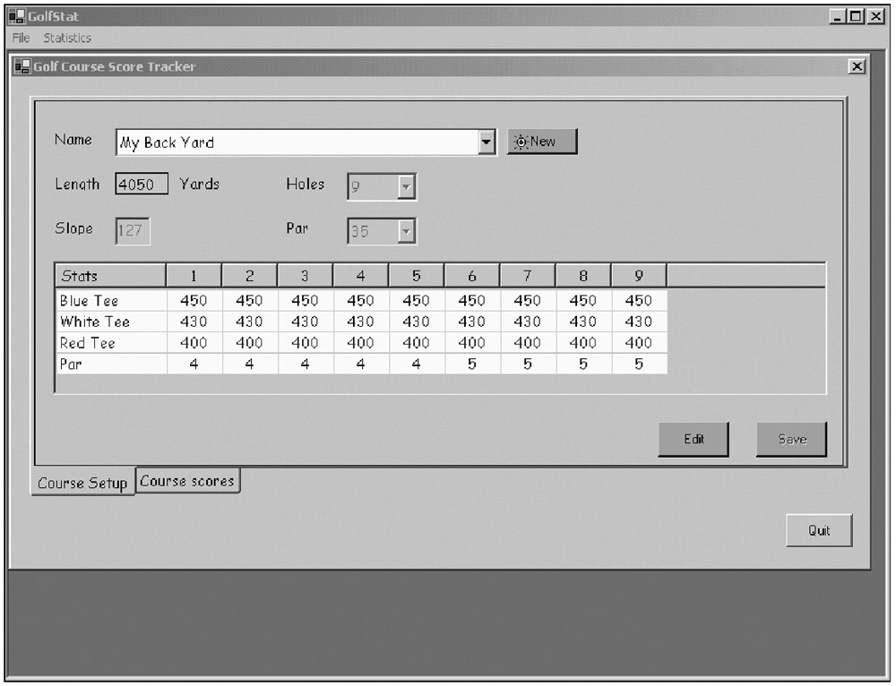 I use a ListView control to show the tee distances. The course ComboBox allows you to choose which course to edit. If the user clicks the Edit button, the controls become enabled for changing. As you see it now, the course cannot be edited. This avoids any error handling when the user is trying to edit course values when he or she is not in edit mode. Instead of telling the user he or she cannot change any values, just don't allow it. If the user wants to edit the values of the tee distances, the user just clicks the first column of the row he or she wants to edit.