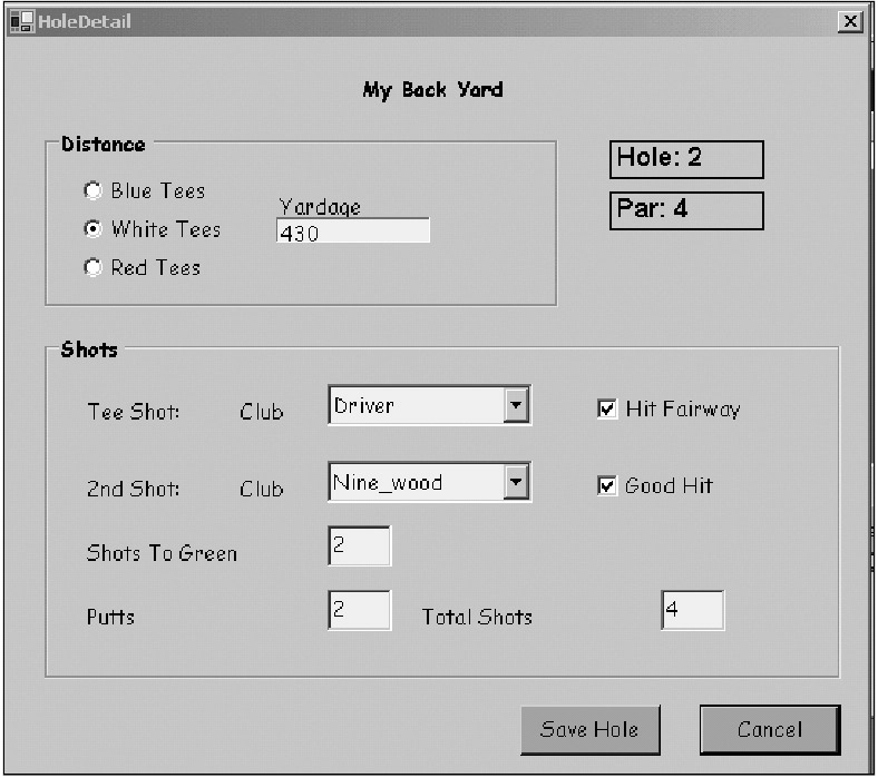 Some of the statistics I keep are standard and some are ones I feel will help me with my game. In any case, when the user saves the hole, I put the Total Shots score in the cell that he or she clicked to get here. Allowing the user to keep his or her scores both ways gives the most flexibility.