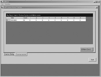Clicking the New Card button will automatically add a new row to the DataGrid. It is not just a new row, though. Behind the scenes I create a new ScoreCard object, populate it with the requisite number of Hole objects, and then display it as a new row. You will see the code for this soon.