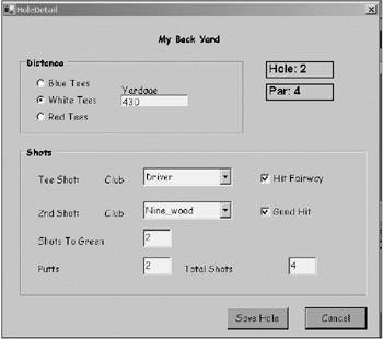 The next screen in this set is the HoleDetail screen. This program would not be much good if I was not able to use it to track more than just the individual hole scores. I am able to type a number into an individual cell or double-click the cell to bring up the screen shown in Figure 11-5.