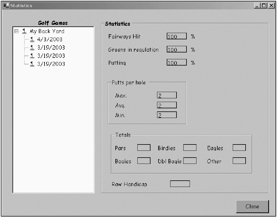 You can see from this code that I use the node's Tag property to contain the actual object in question. As the user selects a node in the tree, I test the Tag object to see if it is an IScoreCardInfo object. If so, I gather some aggregate statistics for each hole played for that scorecard.