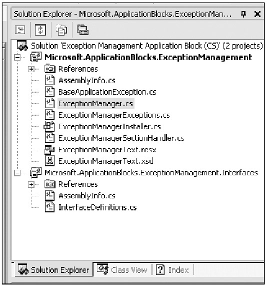 You need to make two DLLs to use in all your future projects. First off, follow the links in your Start menu to the Exception Management Application Block project. Figure A-1 shows the C# project as loaded in my IDE.